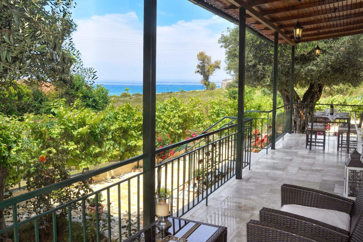 Großer Terrasse mit Gartenmöbeln und Blick aufs Meer.