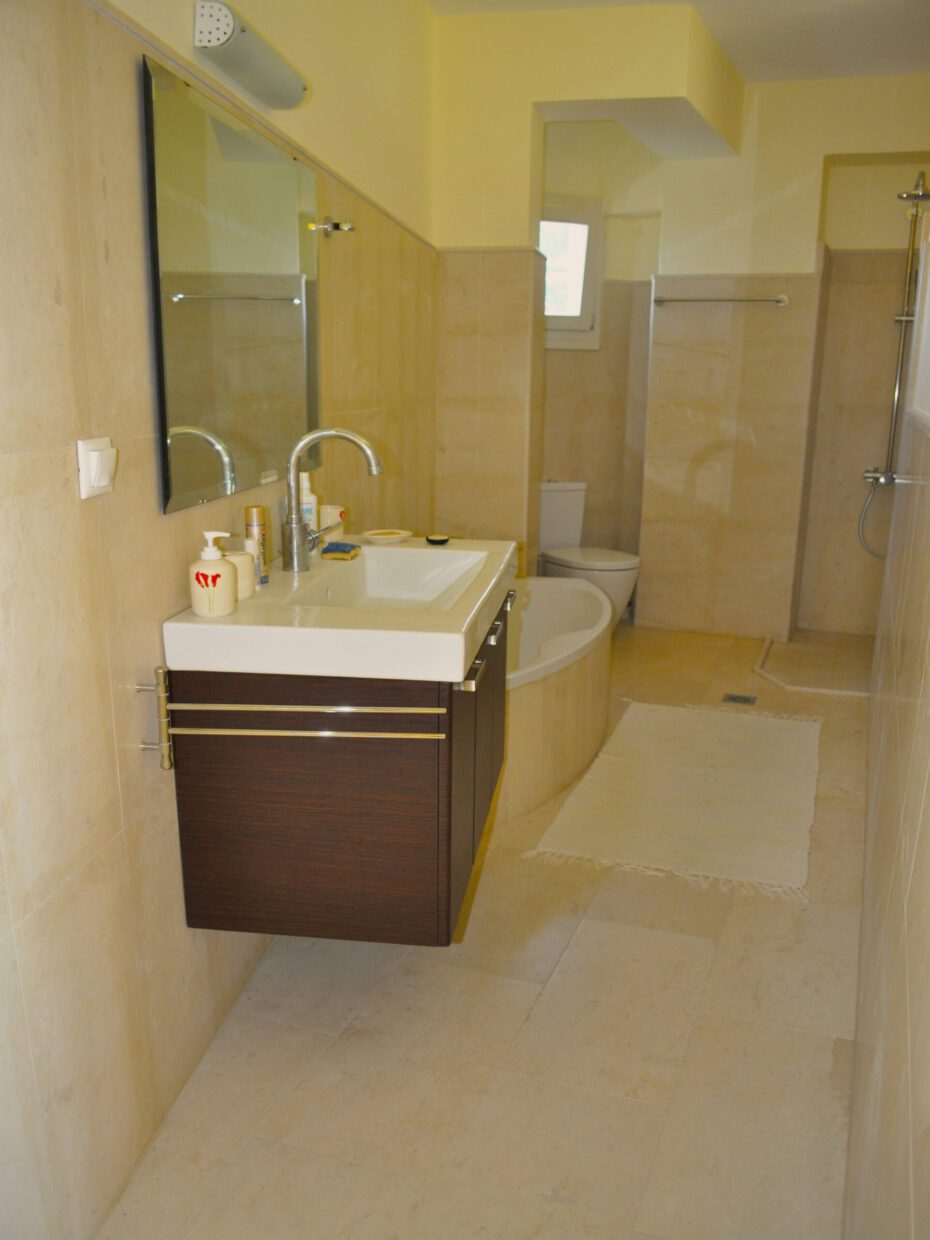 Geräumiges Badezimmer mit Badewanne und Dusche.